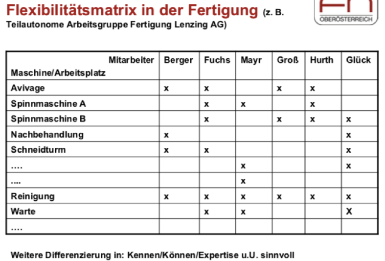 Dieses Beispiel zeigt eine Kompetenzmatrix für ein Arbeitsteam in der Fertigung. Es könnte sich jedoch auch um die Mitarbeiter eines Gemeindeamtes, einer Station im Krankenhaus oder eines Bereichs in einer Behinderteneinrichtung handeln.