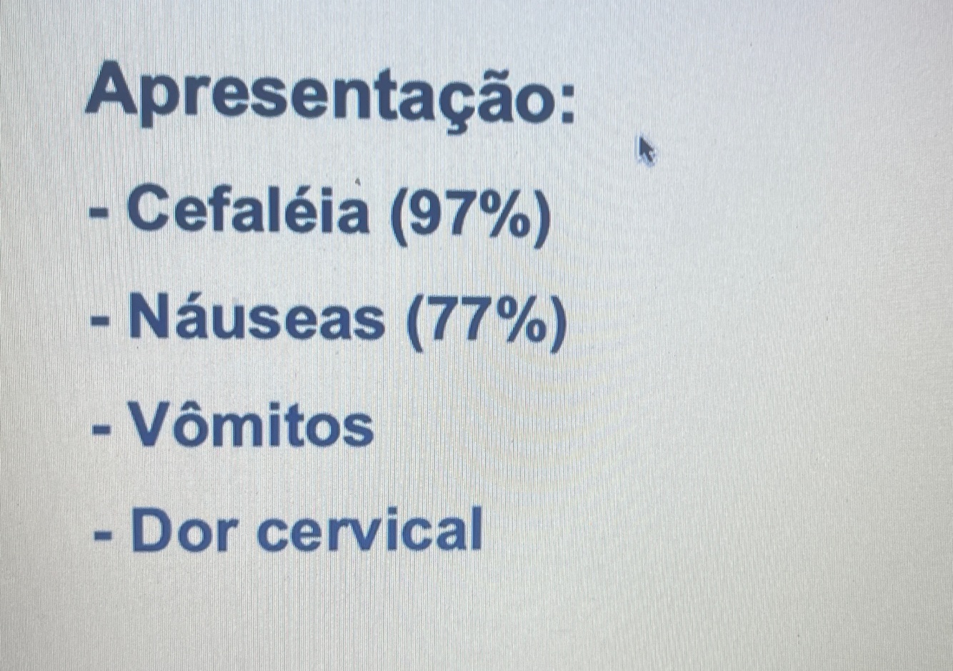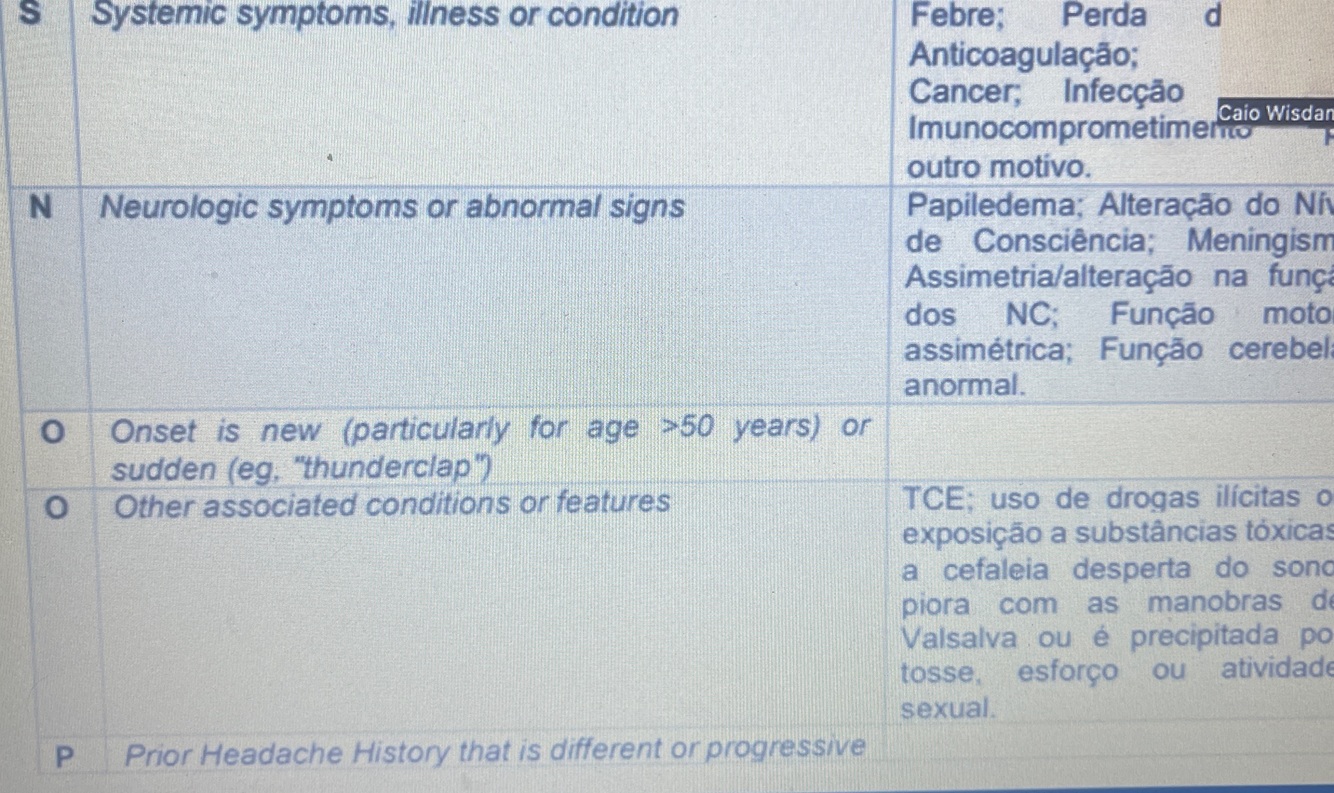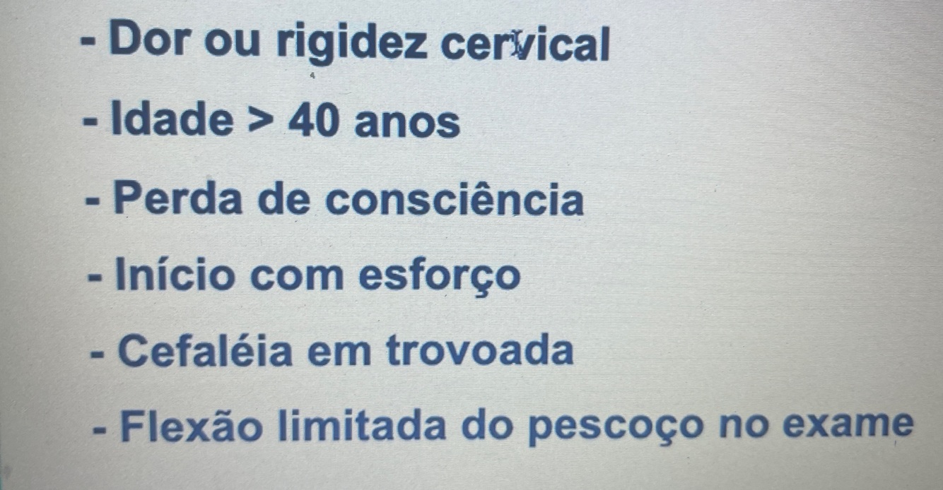 O: Cefaleia na paciente com mais 50 anos nova ou que mudou ou em trovoada, rápida e muito grave em menos de 1minuto