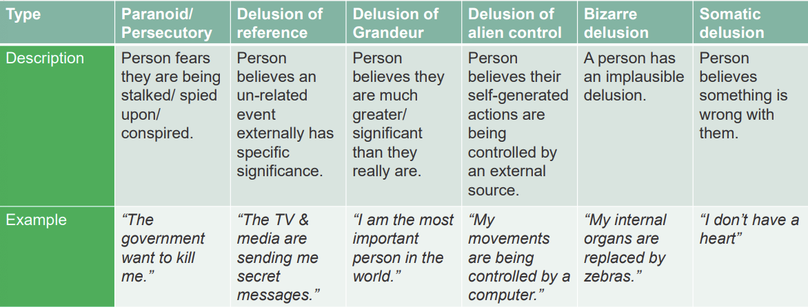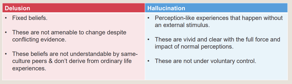Delusions: Fixed, false beliefs that don’t change even when shown clear evidence they’re wrong — they’re not shared or explained by normal experiences.