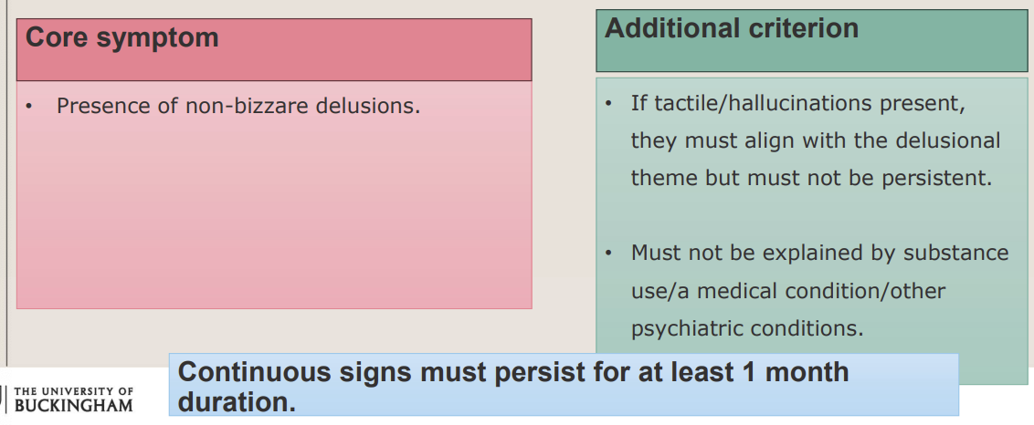 Which symptoms must one have to be diagnosed with Delusional Disorder?