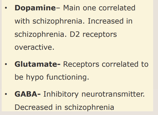 - TOO HIGH IN SCHIZOPHRENIA -> causes positive symptoms i.e hallucinations, delusions and paranoia
