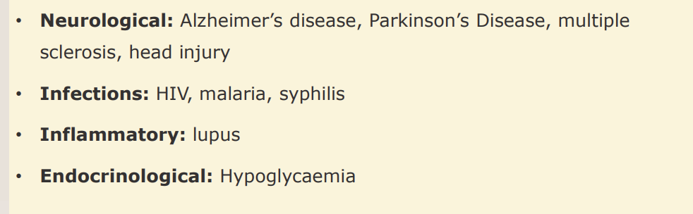 List 4 conditions associated with psychotic symptoms.