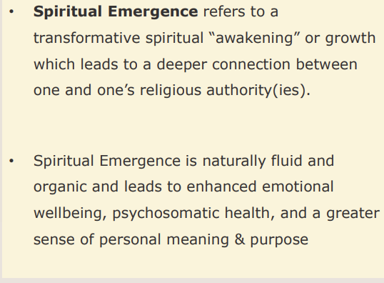 spiritual emergence is a positive, transformative process, like a spiritual “upgrade” - key idea is that you are expanding your consciousness and connecting deeply with meaning, purpose and inner peace - EMOTIONALLY ENRICHING AND MANAGEABLE