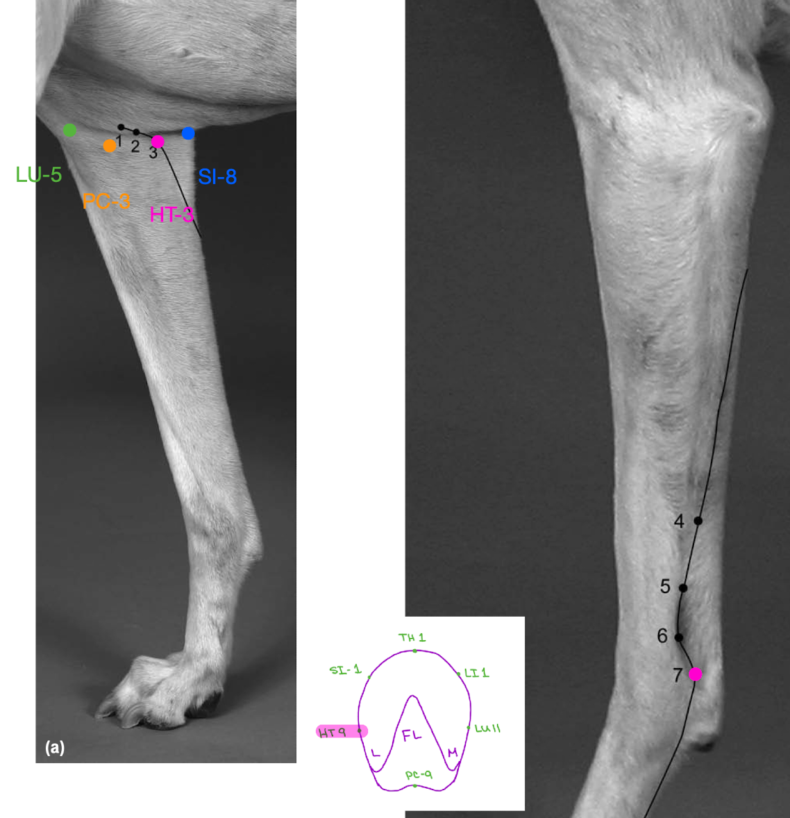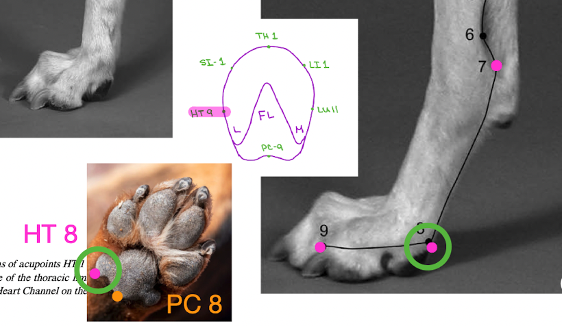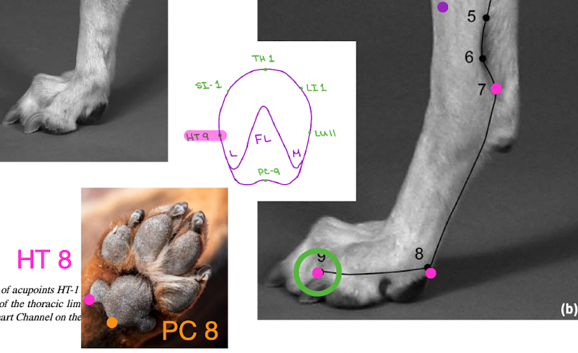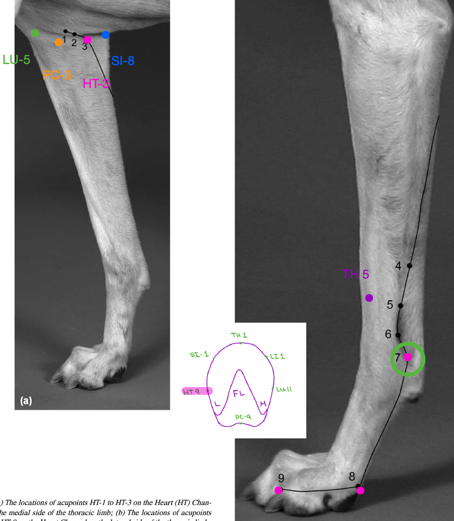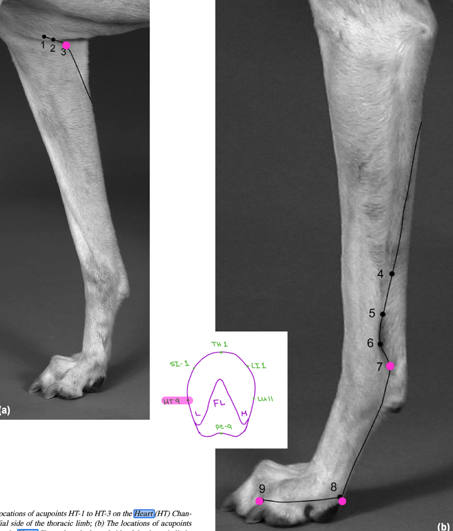 HT 1-9: armpit front leg around back to lateral to medial pinky bed FL
