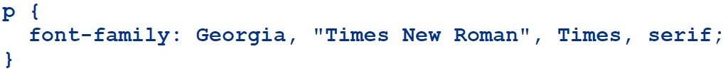 font-family: font name, font name, serif/sans serif/monospace;