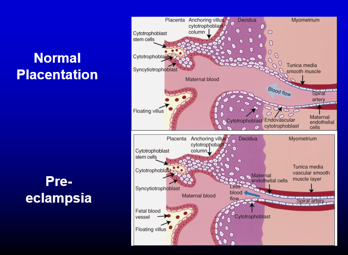 But in PET you get lack of cytotrophoblastic invasion ==> spiral arteries fail to adapt into high capacity low resistance vessels ==> they are narrower causing higher pressure & decreased flow to placenta ==> widespread endothelial damage & dysfunction ==> endothelial activation occurs causing increased capillary permeability, expression of CAM, prothrombotic factors, platelet aggregation and vasoconstriction