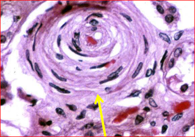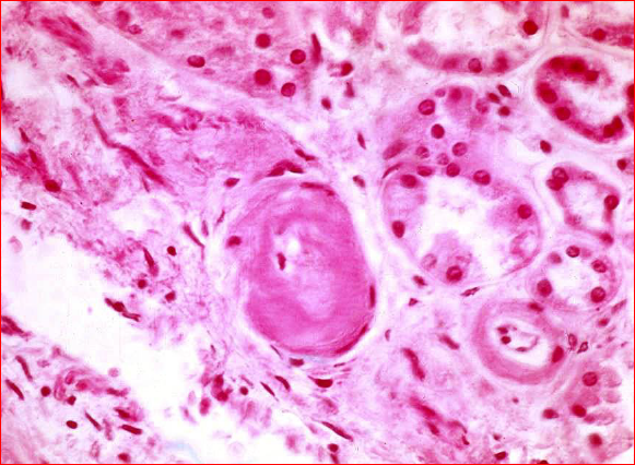 hyperplastic intimal arteriolitis (destructive changes in malignant HTN): concentric proliferation of SMCs and interstitial PG deposition in small arteries and arterioles