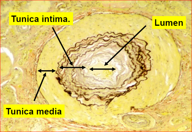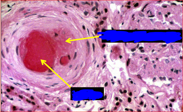 -top arrow is fibrinoid necrosis; bottom is lumen