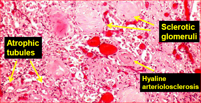 hyaline arteriolosclerosis with glomerular sclerosis and tubular atrophy due to HTN