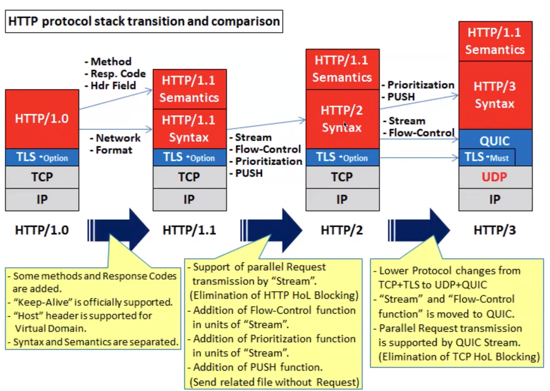 NOTA: En HTTP/3 vemos que va sobre UDP con lo que no se garantiza la entrega. Para ello metemos una capa QUIC que se encarga de la gestión de errores SOLO cuando los haya de manera que las conexiones son más rápidas que con TCP