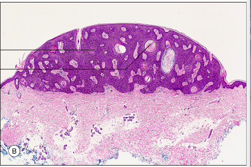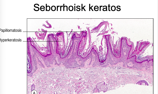 Seborrhoisk keratos: Vanligaste benigna tumören hos äldre. Patogenesen är okänd, men det finns en hereditäs benägenhet.