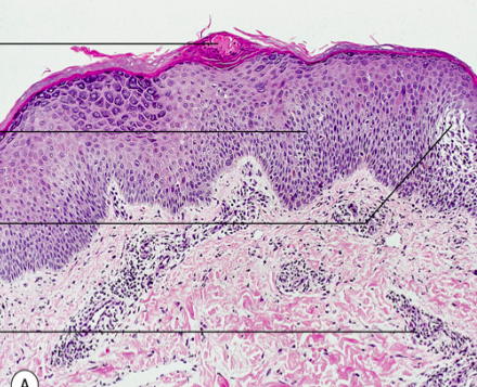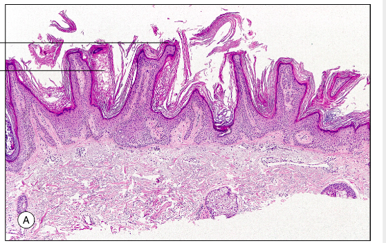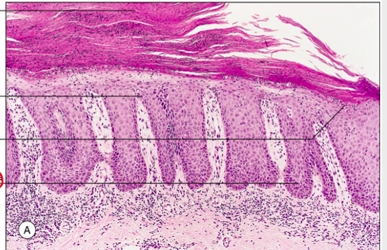 Histologi: Hyperortokeratos, hypergranulos, sågtandad acantos