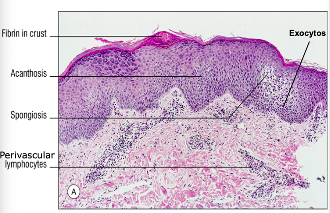 Histologi: Förtjockat hornlager, akantos, förlängda retetappar, lymfocytär exocytps, spongios.