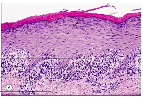 Parakeratos: Kärnor i stratum corneum.