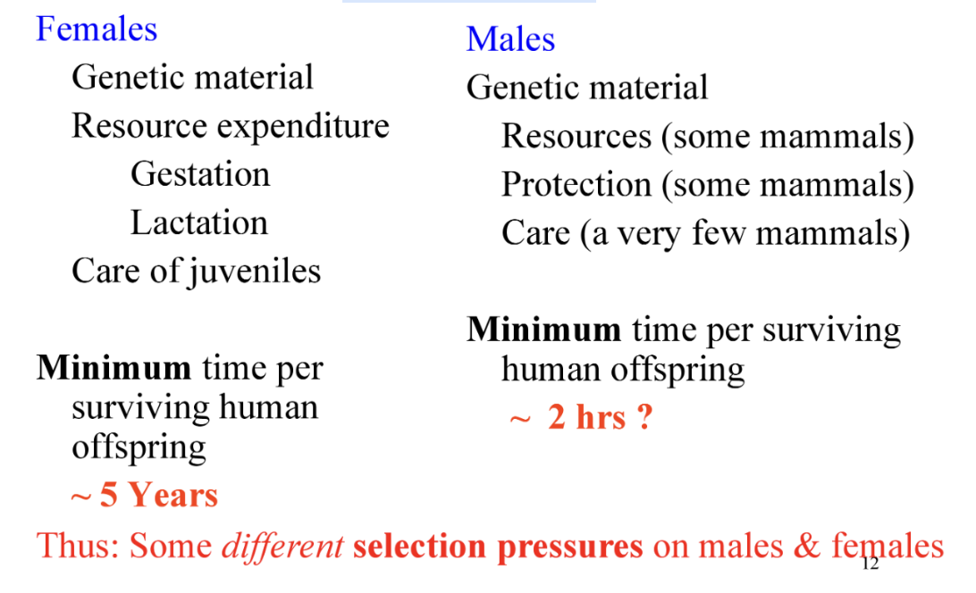 Mammalian females invest more in offspring (gestation and lactation) and so usually increase their fitness more by