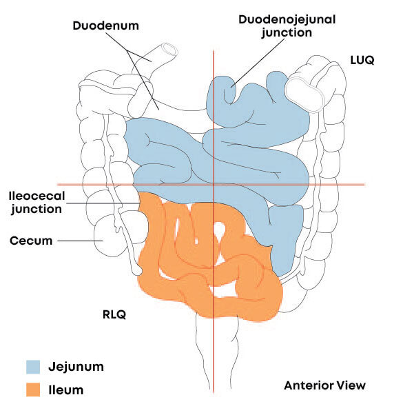 Absorbs bile salts and Vitamin B12, and it also secretes digestive enzymes.