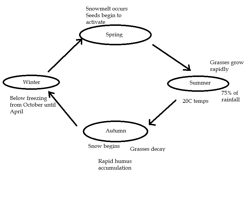 Describe how temperature, rainfall and plant growth vary from each season in the grasslands