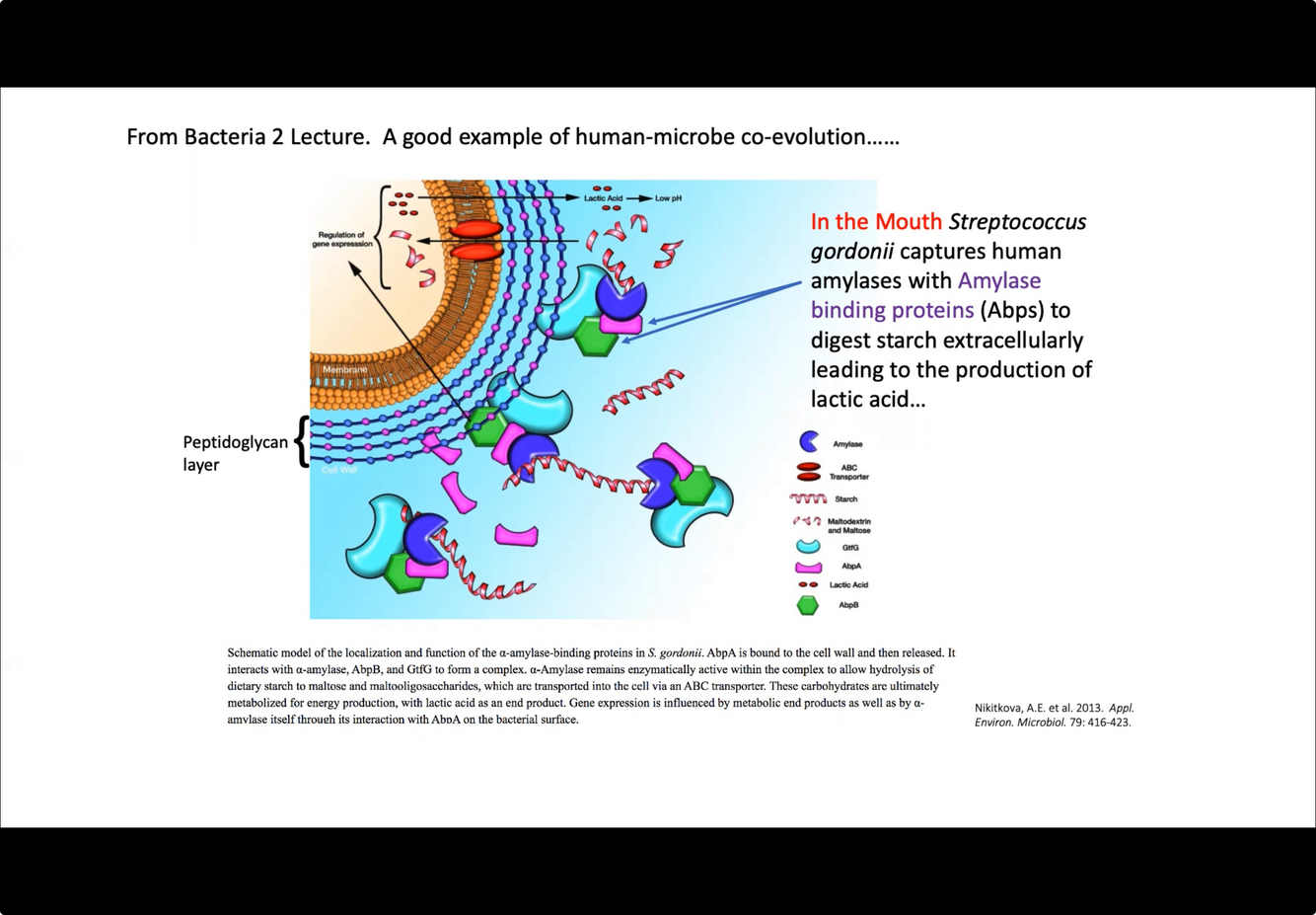 In the mouth Streptococcus gordonii captures humans amylases with Amylase binding proteins (Abps) to digest starch extracellularly leading to the production of lactic acid