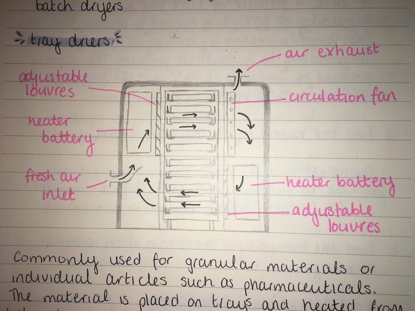 The material is placed on trays and heated from below by a series of coils containing steam. Drying is carried out by the circulation of air over the material, and the moisture in the material trnasferring from the solid to the gas.