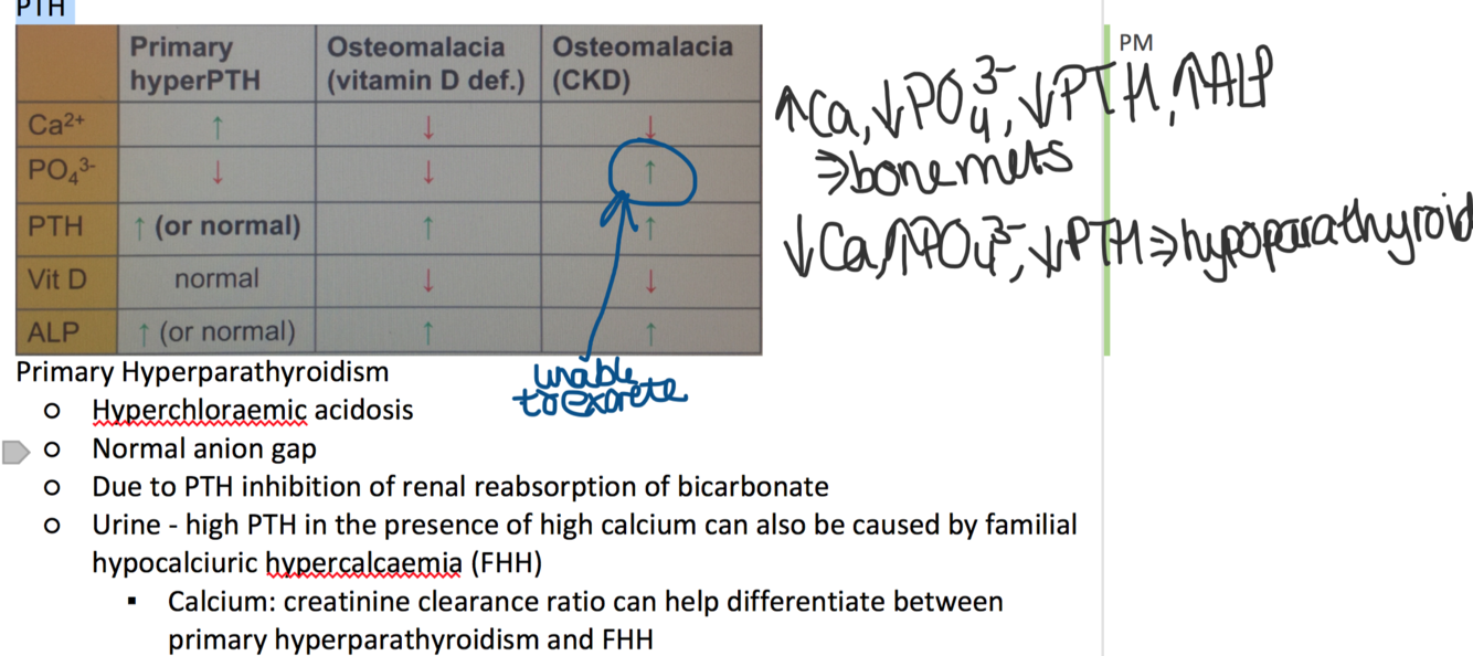 Serum phosphate (low in primary and tertiary and Osteomalacia due to VitD, high in osteomalacia due to CKD)
