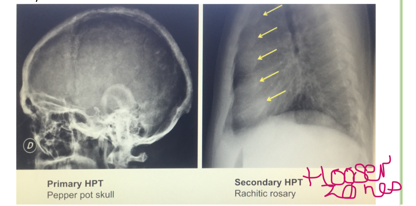 Serum calcium (high in h and tertiary, low/normal in secondary)