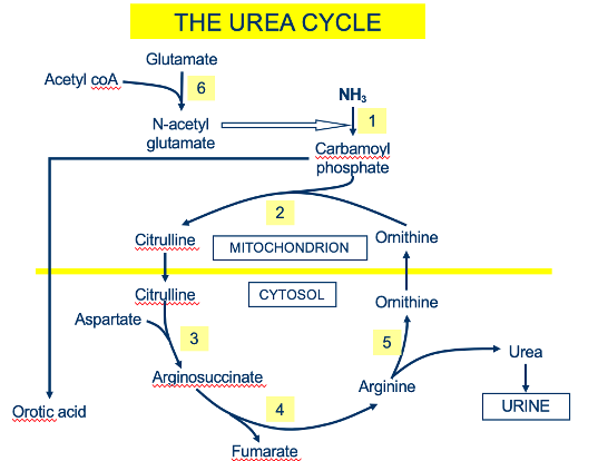 Carbamoyl phosphate is formed from bicarbonate and ammonia. It can be converted to either Citrulline or Orotic acid.