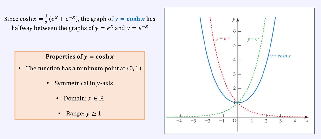 Draw the graph of cosh(x), and what are domain and range?