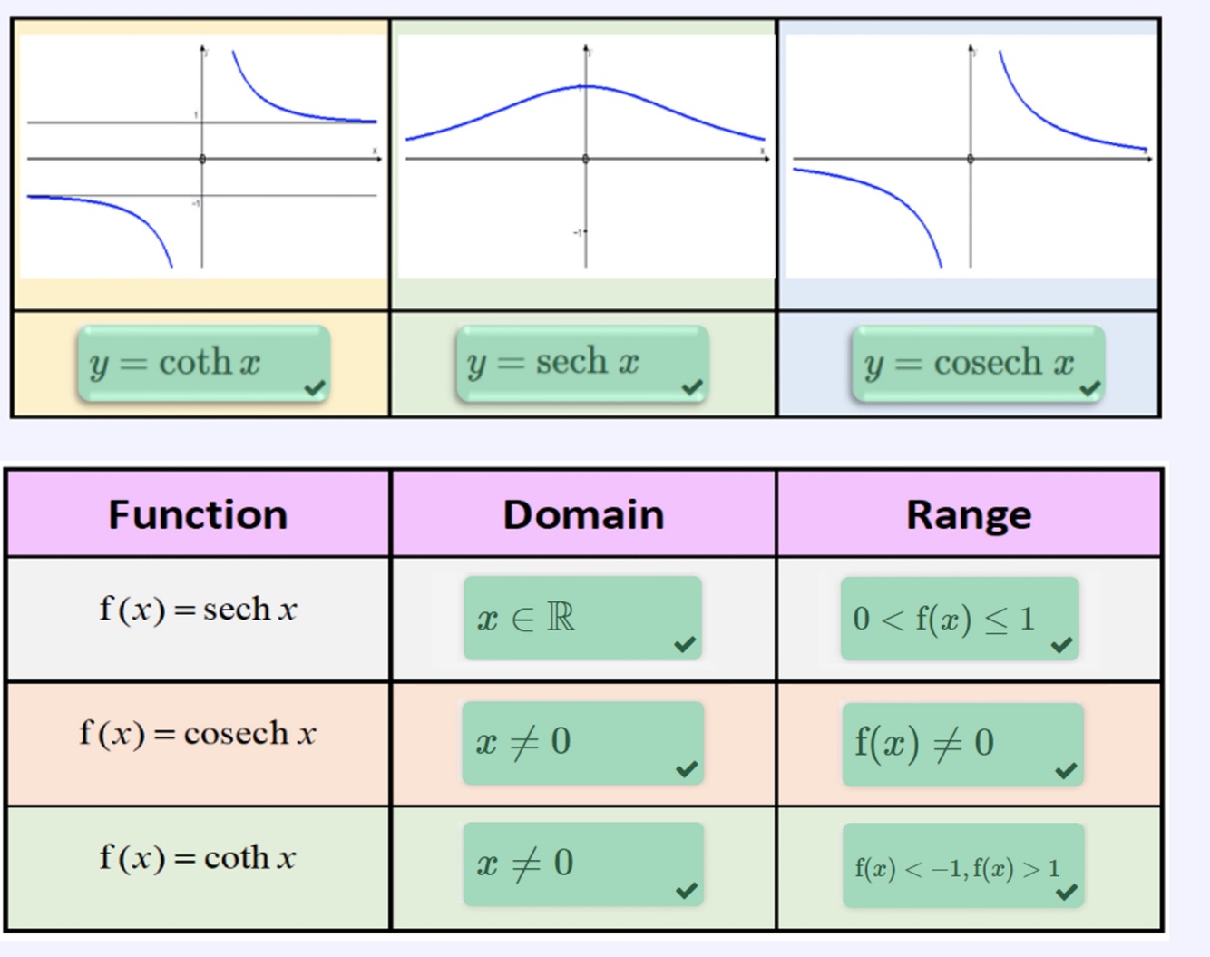 What are the domain and ranges of coth,sech and cosech graphs?