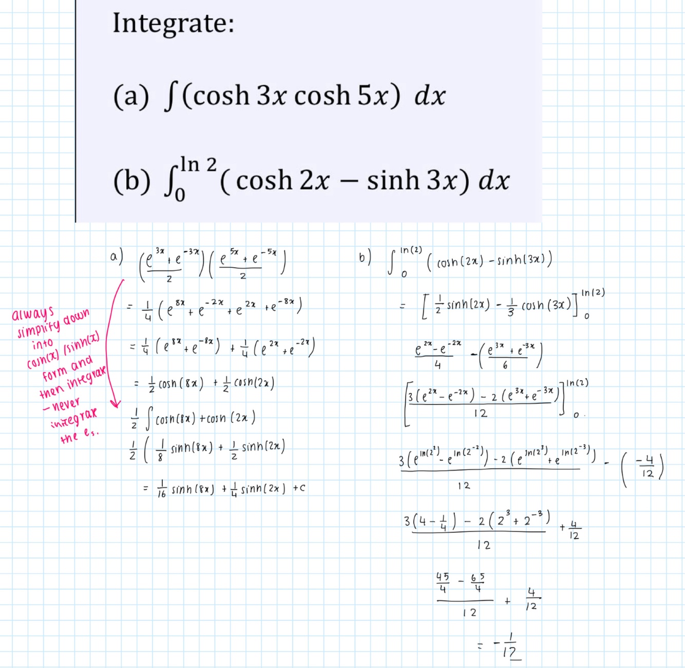 Never integrate the e always simplify to cosh/ sinh form and then integrate