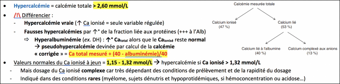 Dans le plasma le Calcium est soit libre dit ionisé pour sa partie active, soit lié aux protéines (à l’albumine ++). Ainsi le calcium mesuré reflète imparfaitement la fraction libre active car dès lors qu’il existe une baisse de l’albuminémie on pourra noter une fausse hypocalcémie alors que le calcium libre est en réalité à un taux physiologique (et inversement pour augmentation de l’albuminémie)
