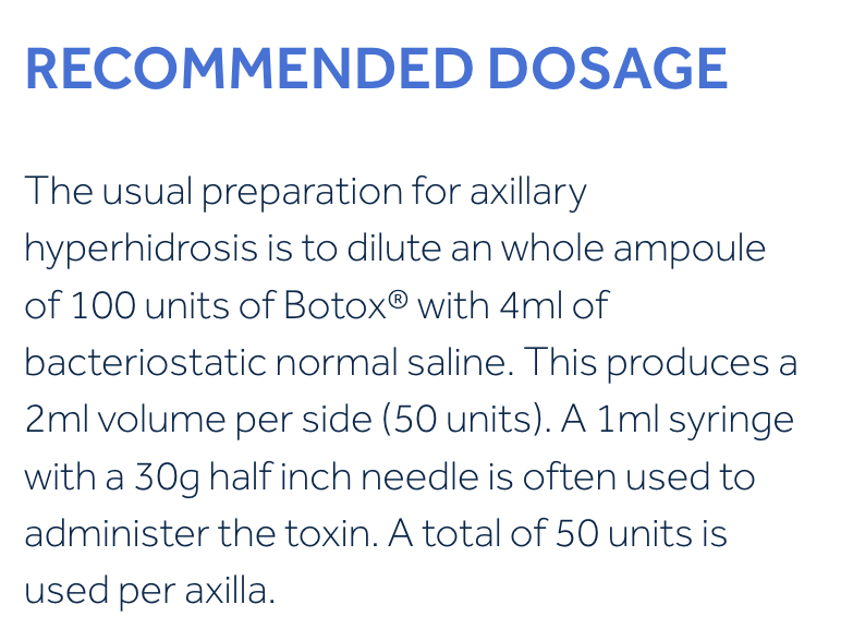 Typically 25 injections per side (0.1mL/2 units each), spaced 1-2 cm apart.