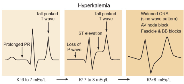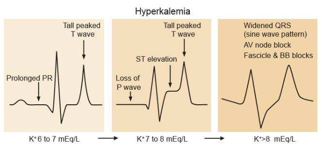 peaked T waves, increased PR interval, absent P waves, prolonged QT interval and widened QRS complex.