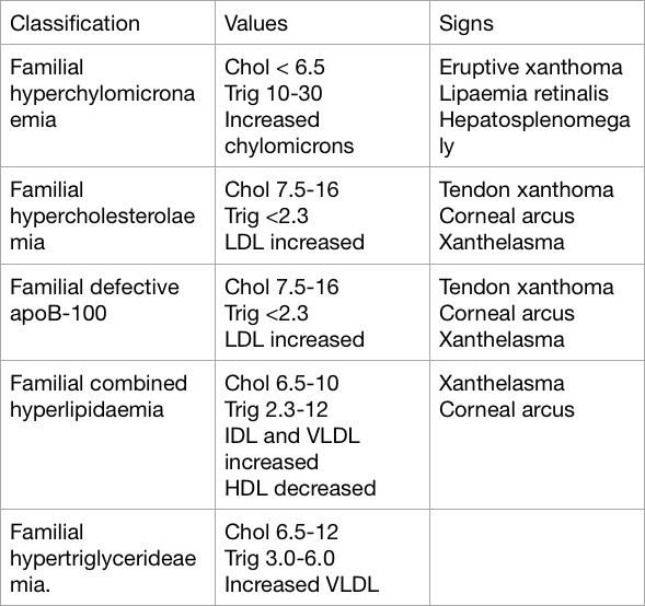 Types of hyperlipidaemia.