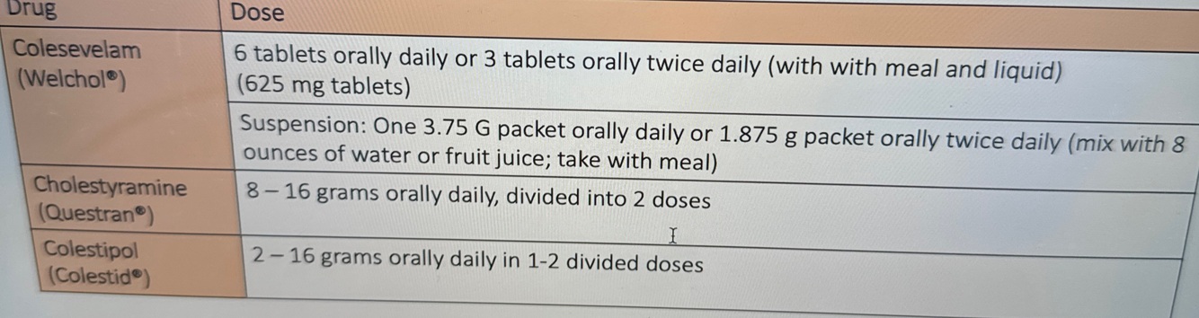 Welchol - 6 tablets QD or 3 t bid with meal and liquid (625mg Tabs)