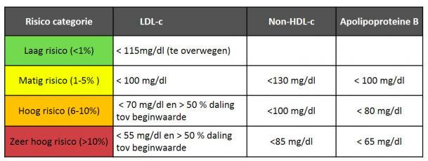 Geef de streefwaarden voor LDL per risicocategorie op CV aandoeningen:
