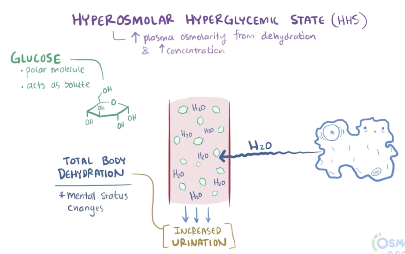 Hyperosmolar Hyperglycaemia State (HHS) is where the blood glucose is high in blood, resulting in a hyperosmolality state, generally associated with low or no insulin. Glucose is a polar molecule so it cannot diffuse across cellular membranes. It also draws blood from intra (inside cells) to extracellular space (blood stream) in an attempt to dilute the glucose. What affect does this have on urine?