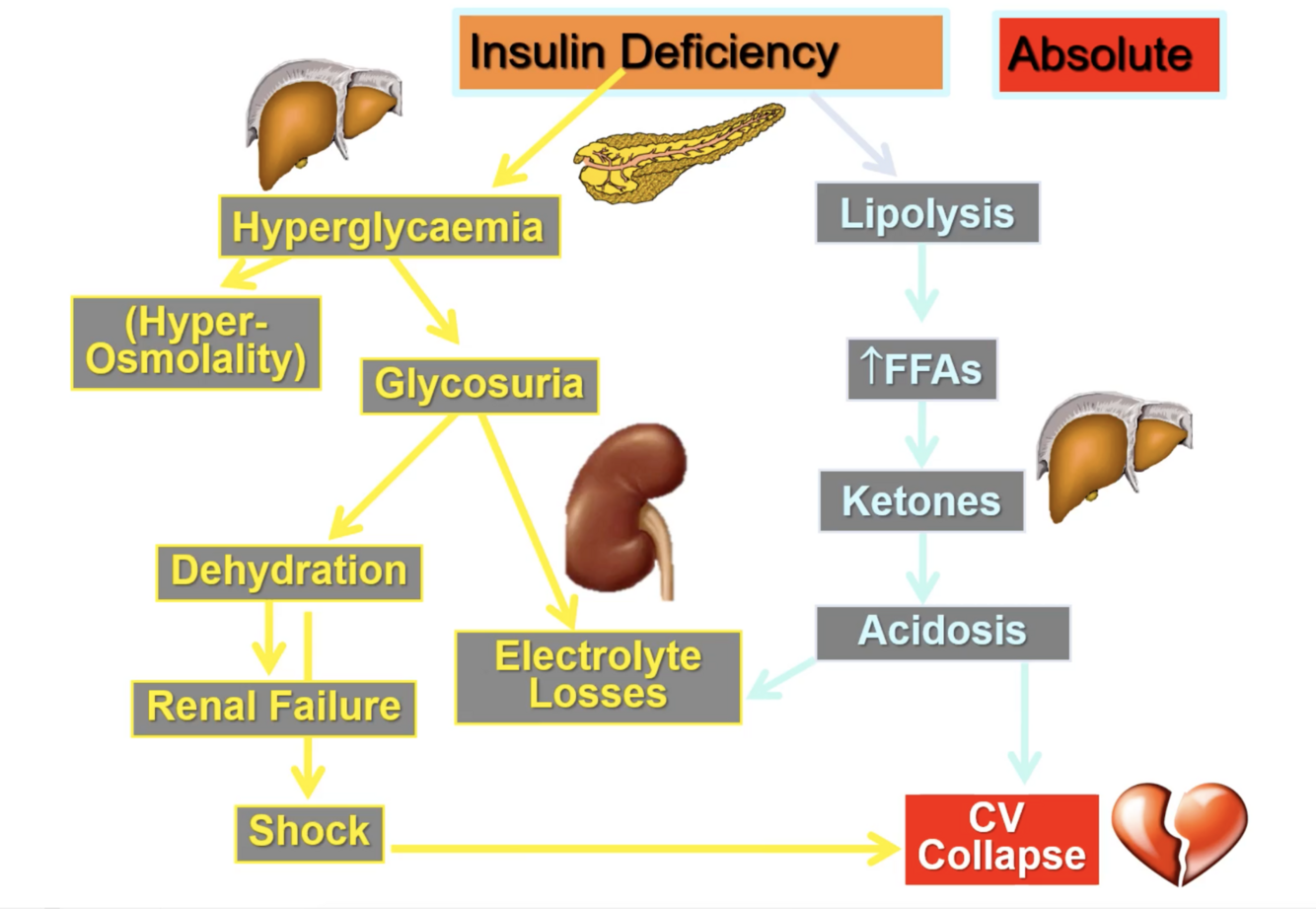 The effects of insulin deficiency and hyperglycaemia can have a number of detrimental effects, culminating in a Hyperosmolar Hyperglycaemia State (HHS), as seen in the image. What does the ultimately lead to?