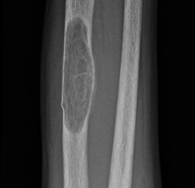 - classically affects the radial aspects of the proximal and middle phalanges of the 2nd and 3rd fingers