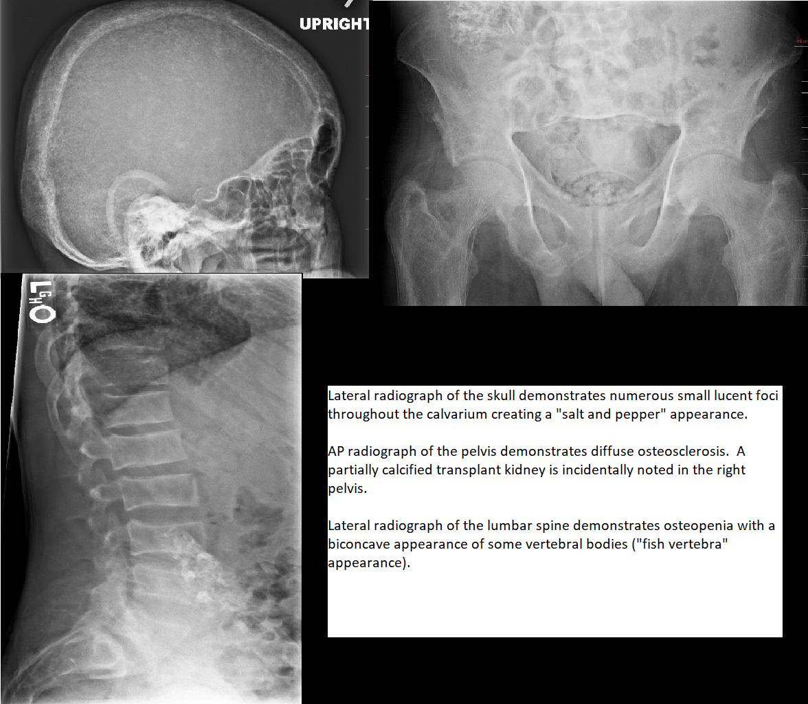 The findings in secondary (and tertiary) hyperparathyroidism are often associated with the osteosclerosis of renal osteodystrophy and the osteomalacia of vitamin D deficiency: