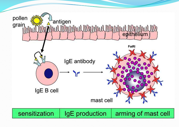 After sensitization, allergen-specific IgE binds to mast cells/basophils. Upon re-exposure, allergen crosslinks IgE, triggering degranulation and mediator release.