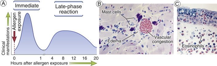 This late-phase reaction happens several hours following exposure and is the characterized by infiltration of neutrophils and eosinophils in response to the mast cell signals. It is these cells which are the culprit in tissue damage associated with repeated bouts of allergic reactions.