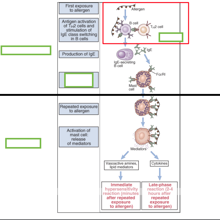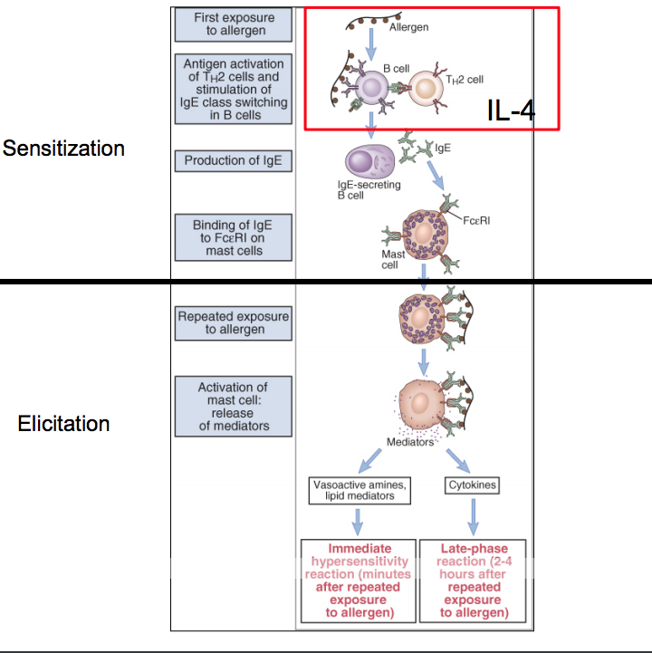 1) Antigen stimulates B cells to produce antigen-specific IgE with T cell help (IL-4 & 13). IL-5 induces eosinophilia.
