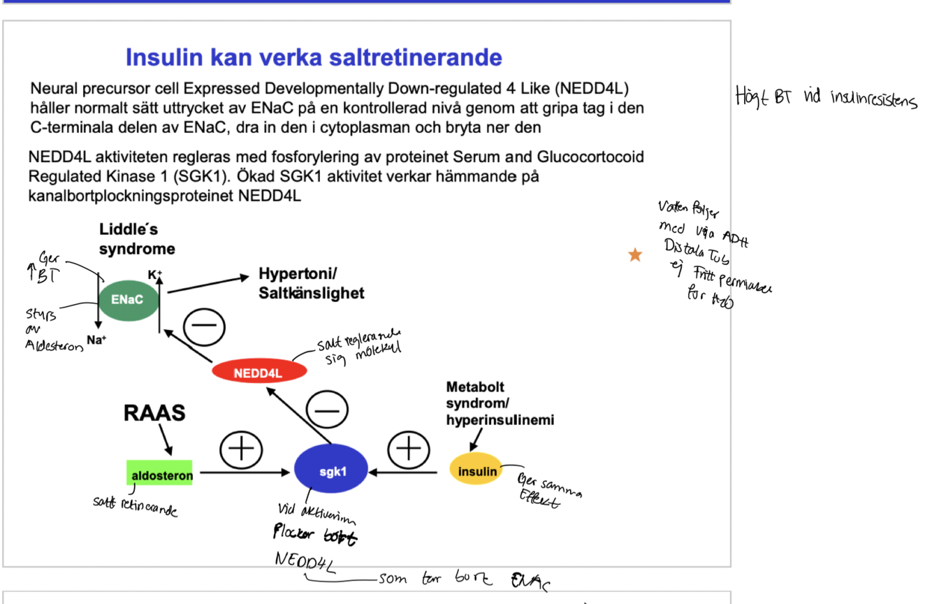 Insulinstegringen som uppstår vid insulinkänslighet kan fungera natriumretinerande (via transkp ökning av ENaC) vilket sekundärt ökar plasmavolymen-> Ökat BT