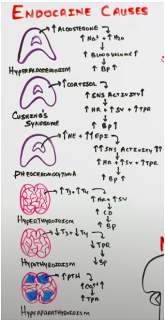 Vilka olika endokrina sjukdomar kan ge hypertoni och vad är dom bakomliggande mekanismerna till detta? (10p)
