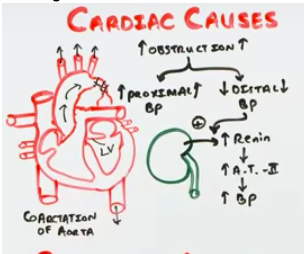 Vilka kardiologiska orsaker kan ge hypertoni och hur? (2p)