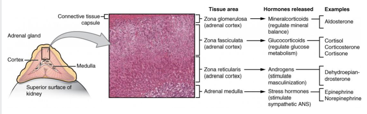 Which hormones are released from the adrenal gland? give specific areas and examples