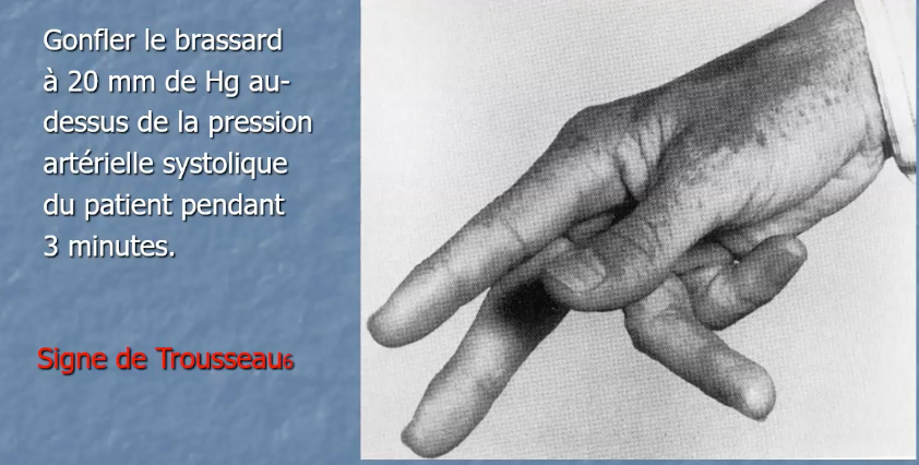 Si tétanie, signe de trousseau, convulsions ou allongement du Qtc à l’ECG