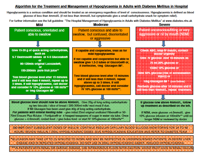 If BG is <4 mmol/L after 15 minutes of giving 15-20g quick acting carbohydrates, repeat initial management up to 3 times