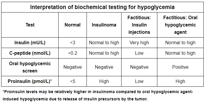 recurrent episodes of hypoglycemia and normal to high insulin and C peptide levels. Tumors are rare and seen in older age. If hypoglycemia screen is negative would get a abd CT scan to look for it