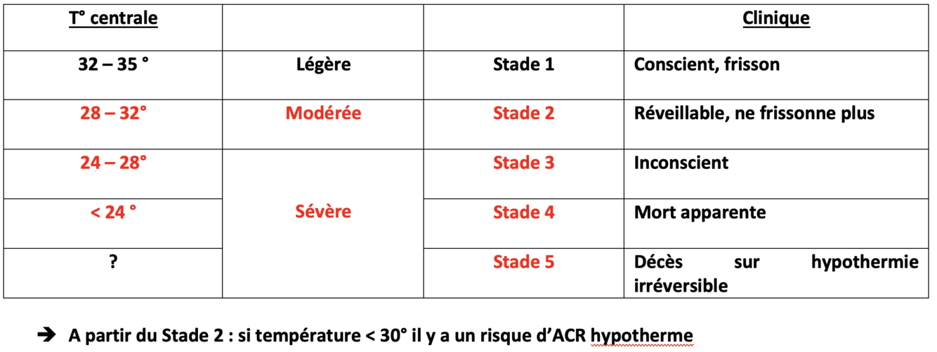 Attention : la détection du pouls est difficile, les signes vitaux sont donc à chercher pendant 60 secondes. La bradycardie et l’hypoTA secondaire à l’hypothermie sont en général bien tolérée (ne pas traiter !). Peser bénéfice-risque de poser une VVP et de faire un remplissage. Intubation indiquée Stade3